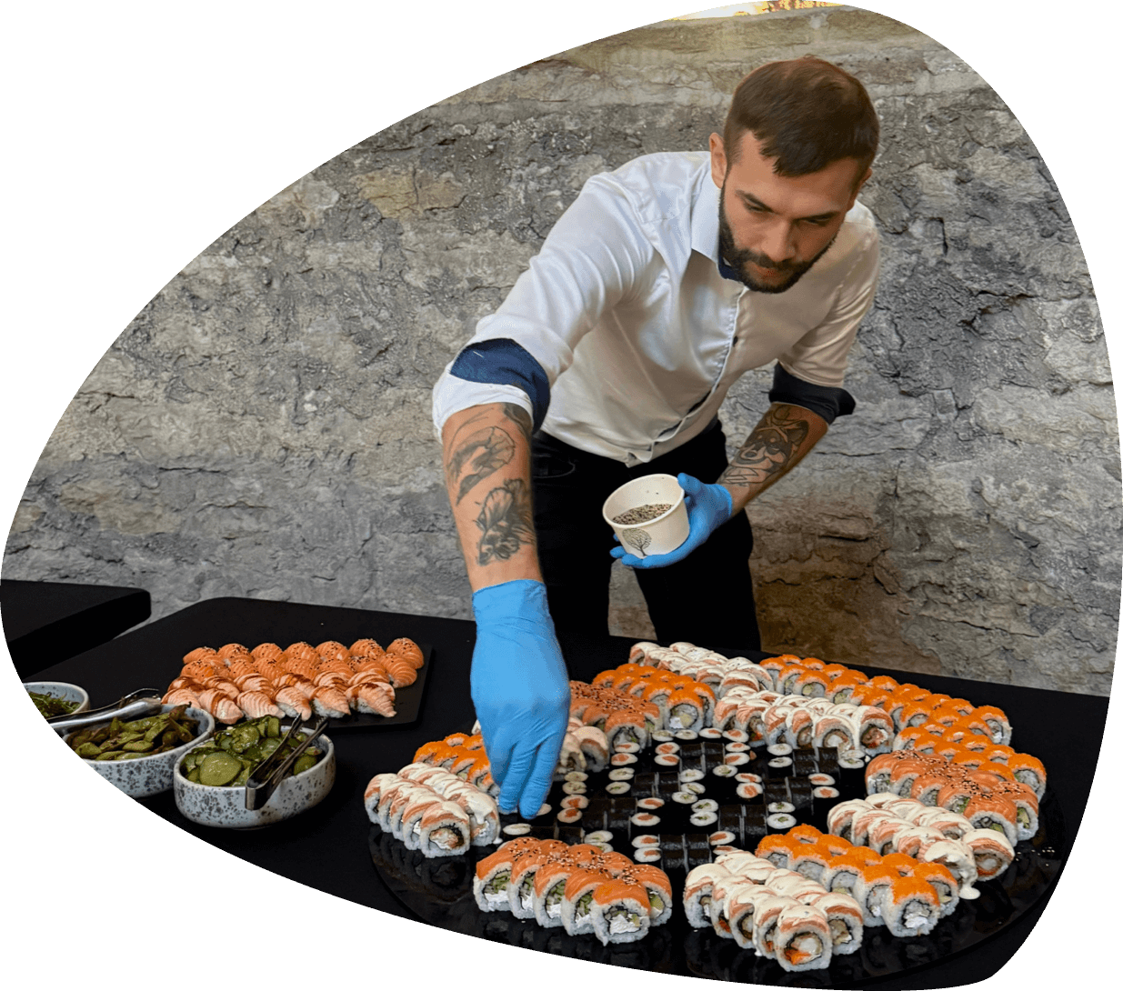 Pakume paindlikke lahendusi – alates värske sushivaliku ja peolaua katmisest kuni täisteenus cateringini. Soovi korral valmistab kokk rulle otse kohapeal, jagades põnevaid lugusid sushimaailmast, ning teenindajad koos baariteenusega hoolitsevad, et kogu üritus kulgeks sujuvalt ja muretult.